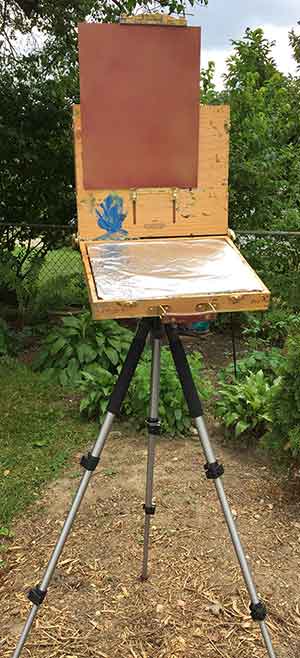 First, I unload my supplies into the ground. I set up my trip-pod and easel. The composition I chose is a vertical one, so the panel is inserted in a vertical format.. Being right-handed, I have the easel to the right of the scene I’m painting. I set the panel closer to the left edge, so it’s closer to the scene.